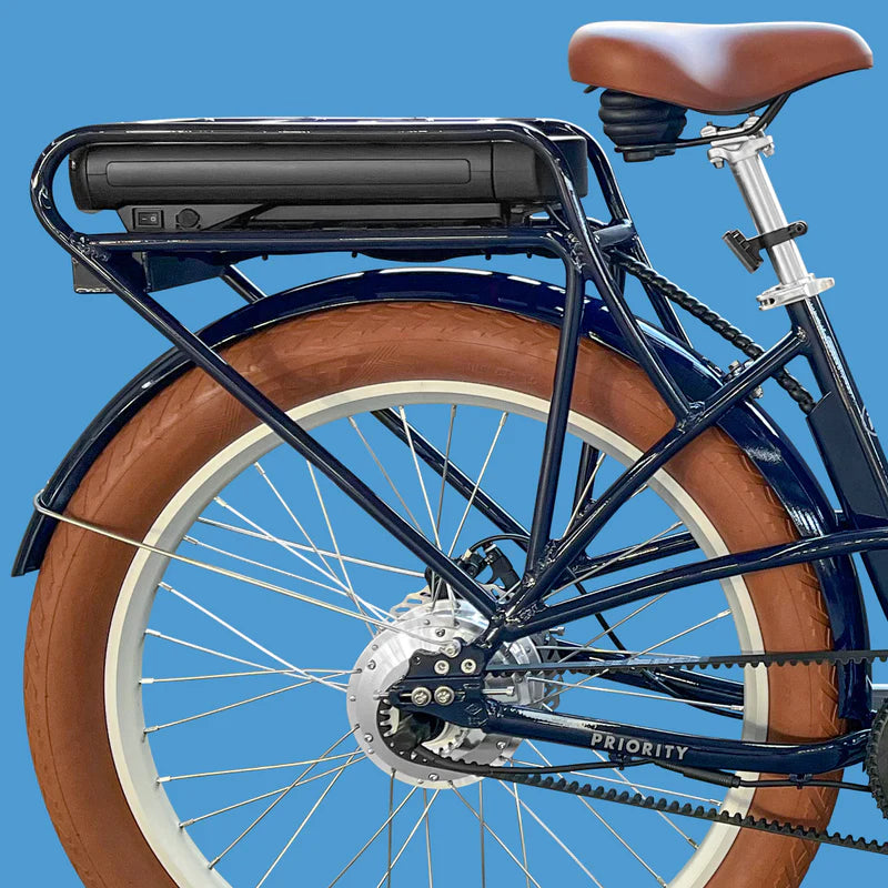 The Priority 500-watt motor is powered by a 576 watt-hour battery that's integrated into the rear rack, keeping the lines of The e-Coast super clean. The battery is easily removable and can be charged on or off the bike. The integrated rack is perfect for loading up all your essentials for a day at the beach, or wherever you plan to set sail. eBike battery UL 2271 certified by SGS. Please review NYC Lithium-Ion Battery Safety information.