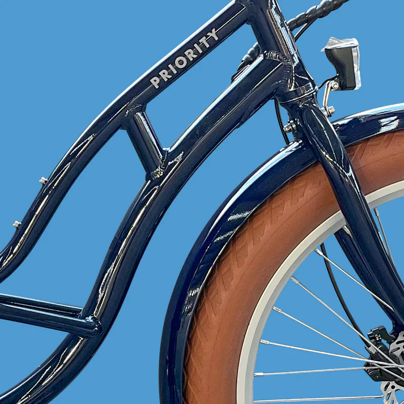 Priority Bicycles provides its bicycle frames and forks with a five (5) year warranty against material and workmanship defects. All components on The e-Coast are backed by a two (2) year warranty against manufacturing defects. The battery is guaranteed for two years or 700 cycles, whichever comes first, to 70% charge. This warranty does not cover paint or decals and can be void if the bicycle was not professionally assembled, has been modified or has been subject to beyond normal wear and tear. This warranty does not cover return shipping to Priority, nor does it cover any labor involved in frame, fork or other component replacement. Product defects must be confirmed by either photograph or a professional bicycle mechanic. This warranty is valid only for original owners in the continental United States.