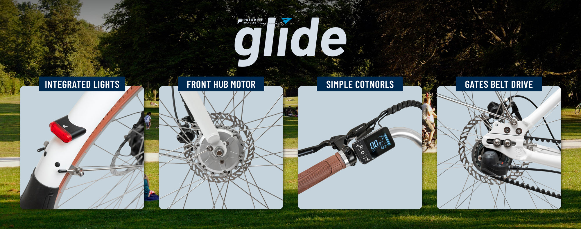 We chose this motor because it's lightweight and low-drag, delivering a natural ride feel without adding bulk. Placing the motor in the front allows us to pair it with the Gates Belt Drive and Shimano Nexus 3-speed drivetrain—an ultra-reliable, low-maintenance combo that defines the Glide. It also helps balance the bike’s weight front to back, creating a smooth, stable, and easy-to-control riding experience.