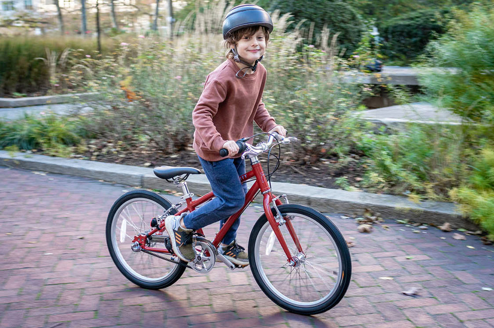Our Start 20" and 24" models feature a Shimano 3-speed hub—the same hub we use on our adult recreational bicycles—offering a nice gear range with simple intuitive usage for climbing hills (gear 1), flat cruising (gear 2), and gaining speed (gear 3).